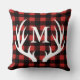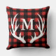 Get that rustic and warm lodge or cabin style in your man cave or any room with this amazing throw pillow. It has a black and red buffalo style plaid design with a white deer antlers design and monogram letter. Pillow is the same on both sides.