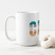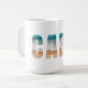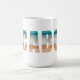 This ceramic coffee mug is shown with a lettered Cabo beach print.