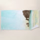 This beach towel has a watercolor image of the sun set behind el arco in Cabo San Lucas Mexico. Text at the bottom reads "Cabo San Lucas Mexico" in an aqua serif typeface. This design coordinates with other designs from the Cabo San Lucas Wedding Collection.