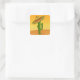 A fun sticker for your next fiesta or Cinco de Mayo celebration features a green cactus with sombrero on gold desert background.