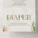 Neutral boho baby shower theme with "BABY" and "DIAPER" lettering in leather inspired faux texture decorated with boho cactus and other botanical designs. Botanical designs at corners. Background is watercolor inspired.