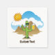 Cartoon of smiling cactus with sunglasses in desert landscape holding a beer mug and giving thumbs up. Custom text.