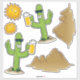 Cartoon of smiling cactus with sunglasses holding a beer mug and giving thumbs up. Sun and mountains icons.