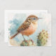 This postcard features a watercolor painting of a cactus wren, capturing the spirit of the desert with vibrant detail and soft artistic flair. The cactus wren, known for its bold personality and distinctive markings (and Arizona state bird), is depicted with warm earthy browns, soft peach, and subtle white streaks, highlighting its intricate feather patterns. Perched confidently atop a spiny cactus, the bird’s sharp gaze and delicate features contrast with the rugged textures of the cactus.