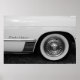 A Black and white photograph of the wheel and trim of a 1950s Cadillac.