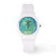 Trendy watercolor splash paint effect caduceus nursing school graduation gift watch for rn nurses- Black caduceus medical symbol against a faux watercolor background in shades of aqua green with a blue turquoise paint swirl framing it. Personalised name of nurse at bottom. Matching black clock face numbers. Stylish, personalised graduation gift for registered nurses, lpn nurse, and other medical school graduates. On both women's and men's watch styles.
