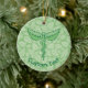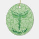 Single snake caduceus with mint leaves on light green seamless background. Custom text on both sides.