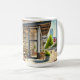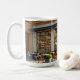 This painting illustrates a cosy cafe storefront in Dallas, combining sleek modern design with inviting charm. The cafe features large glass windows framed by polished metal, a minimalist sign above the entrance, and a warm brick facade. Potted plants by the doorway and subtle greenery add a fresh touch. The outdoor seating area, with its modern wooden tables and chairs, is neatly arranged along the sidewalk, inviting patrons to relax. The backdrop showcases contemporary Dallas architecture under a clear blue sky, creating a harmonious urban setting. The bright, clean palette of crisp whites, warm wood tones, and fresh greens conveys an atmosphere of liveliness and comfort, perfect for enjoying coffee in this tranquil city spot.