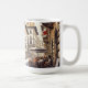 The watercolor painting beautifully depicts a small cafe situated in a narrow alley in Florence, Italy. The scene is framed by historic Florentine buildings adorned with intricate stonework and Renaissance architectural details. The cafe's outdoor seating is filled with a mix of tourists and locals, who are engaged in lively conversations while enjoying traditional Italian espresso and pastries. Overhead, hanging flower baskets and fluttering laundry add to the quintessentially urban Italian atmosphere. The painting uses a soft, earthy colour palette of burnt sienna, warm yellows, and faded greens, enhancing the historic and vibrant charm of Florence.