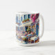 The watercolor painting beautifully captures a café in Mykonos, Greece, set against the charming backdrop of white-washed buildings with iconic blue doors and window frames. The outdoor seating area, adorned with colourful cushions, offers a stunning view of the bright blue sea, embodying the vibrant atmosphere of the Greek islands. Patrons, a mix of locals and tourists, are depicted enjoying Greek coffee and light Mediterranean fare under a clear azure sky. The scene is further enhanced by potted olive trees and vibrant bougainvillea, adding natural splashes of green and pink to the composition. The painting uses a palette of bright whites, deep blues, and vibrant pinks to reflect the lively yet relaxed island life of Mykonos, capturing the essence of this picturesque setting.