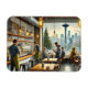 The watercolor painting captures the serene and inviting ambiance of a café in Seattle, with the Space Needle prominently visible through large rain-speckled windows. Inside, warm golden tones from hanging Edison bulbs highlight wooden tables and minimalist chairs. A man in a grey hoodie reads quietly at a corner table, while a woman in a bright yellow scarf near the window photographs her artful cappuccino. A group of friends, seated at a communal table, share pastries and laughter, adding a touch of vibrancy to the scene. Outside, the rainy streets reflect the soft glow of the overcast sky, blending with the iconic silhouette of the Space Needle to create a perfect harmony of urban charm and cosy refuge.
