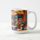 The painting captures a quiet moment at a small cafe in Taos, where adobe-style walls are adorned with turquoise shutters that pop vividly against the warm terracotta facade. Patrons relax at rustic wooden tables draped with vibrant woven textiles, sipping coffee and chatting. Brightly coloured pots of desert blooms flank the entrance, blending seamlessly with the earthy tones of the architecture. The backdrop of towering desert mountains and a brilliant blue sky adds depth and grandeur to the scene, reflecting the harmony of Taos’ natural and cultural landscapes. The cafe radiates warmth and creativity, a microcosm of the town’s eclectic vibe.