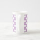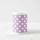 Bone China Mug designed with an assorted polka dot pattern with alternating sizes of white circles over a cafe-style purple, and outlined on the top and bottom in grey.