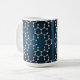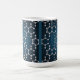 This coffee mug features a caffeine molecular structure pattern on a blue gradient background. The structure consists of interconnected hexagonal rings made up of white spherical atoms connected by gray bonds. Each hexagonal unit is identical and arranged in a repeating pattern across the image. The spheres have a metallic, glossy finish that reflects light, creating subtle highlights and shadows. The bonds between atoms are rendered as thin gray lines. The pattern creates a tessellating effect where multiple hexagonal units interlock. The background transitions from a darker blue at the edges to a lighter blue in the center, creating a subtle vignette effect. The entire structure is in high detail, showing individual atomic bonds and spherical particles in sharp focus. The mug is a fifteen ounce classic mug.