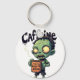 A circular keychain featuring a cartoon zombie holding a coffee cup that reads "Caffeine Keeps Me Alive," with "Caffeine" in a dripping font above its head.