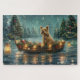 Set sail into the magic of the holiday season with this beautifully detailed illustration, showcasing a proud dog sitting in a festively decorated boat, gliding across a serene Christmas lake. The twinkling lights from nearby pine trees reflect off the water, casting a warm, festive glow that enhances the cosy ambiance. Ornaments dangle from the boat's sides, while glowing lanterns light the way, creating a scene that captures the true essence of Christmas warmth and joy. This nostalgic artwork brings a touch of holiday magic to any space, perfect for those who cherish the spirit of the season.