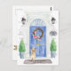 Announce your new address with our stylish announcement featuring a Cairn Terrier, blue front door, welcome mat, slate sign, topiaries and a floral wreath set on a grey brick background.