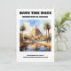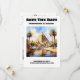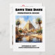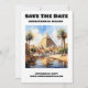 A watercolor painting of a pyramid in Cairo flanked by palm trees reflected in water appears on the front of this "save the date" invitation and the back has a photo template for the wedding couples photograph. Both sides have black font templates for your personalised wording and the back has a small aeroplane with a dotted line behind it showing its flight path together with a red destination location symbol for the name of the town you will be having your wedding at plus a qr code template. If the qr code is not required, simply delete it.