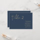 This table number seating chart features an edgy handwritten font and modern minimalist design with a modern navy blue and gold combination. Easily change the number and the names along with all of the colours to fully match your event.