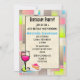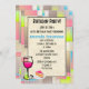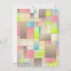 A modern design birthday invitation. The background is an abstract illustration with large and small squares and rectangles with intersecting lines. This creative design has contrasting pastels and brights in the colours of cream, rose pink, lime green, light brown and bright blue. The centre has a parchment texture box with a black border, enter your personalised party details. At the bottom is a wine glass filled with red wine and a slice of cake. Great for cake and cocktails style birthday parties for adults.