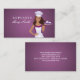 Two sided business card template for bakers with professional illustration of a fashionable baker woman wearing a chef hat holding a tray with desserts. The graphics are very elaborate. This boutique style card is modern and professional. Matching items available.