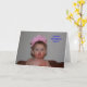 A CAKE FACE FACE that's CUTE as can be. With a pink princess head band that's bright and colourful. That has a surprised look on her face. That's on a Card.