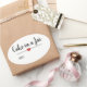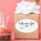 Modern oval "cake in a jar" sticker with a black script font on a blush pink background embellished by a cute red heart. Customise text.