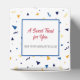 This delicious design features a scrumptious cakes on the front, back and sides of this favour box, which is set on a colourful confetti background. A fun design that works well for birthdays, anniversaries or other special occasions. The text on the top reads, “A Sweet Treat” and “ Thank You For Sharing My Special Day.” All text can be customised.