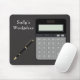 This Mouse Pad has a unique design on the front featuring a calculator graphic with grey keys and white lettering and also a Pen graphic in black. The text and background colour can be changed to suit your own requirements. Impress your fellow work colleagues.
