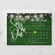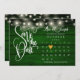 This pretty save-the-date card features string lights and a calendar and a pretty gold love heart highlighting your special date on a rustic emerald green wood panels background.