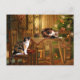 Two calico or tortoiseshell with white kitties in a Christmas setting.......one sitting prettily on a chair the other cleaning herself on a table in typical cat fashion.......cat lovers holiday greeting postcard