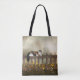 Beautiful long haired calico kitty cat settles on the fence in the garden and looks out on the small sunflowers or large black eyed susans cat lovers tote bag