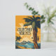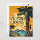 California, palm tree on the beach, sunset on the distance, behind the mountains. Travel postcard in vintage style.