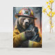 A bear wearing firefighter gear stands amidst a forest fire, hugging a piece of charred wood.