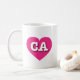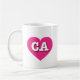 This mug features a vibrant hot pink heart containing the bold, white, upper case letters CA, the official abbreviation for California, the golden state.