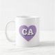This mug features a lavender heart containing the bold, white, upper case letters CA, the official abbreviation for California, the golden state.