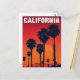 Capture the intense, warm colors of a California sunset with this bold, graphic retro travel postcard. The design features the iconic silhouette of tall palm trees against a fiery orange and red sky, evoking the laid-back, beautiful atmosphere of Southern California and the West Coast. This is an essential piece for collectors of stylized Americana and vintage poster art.