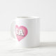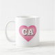 This mug features a pink heart with a white-washed centre containing the bold, white, upper case letters CA, the official abbreviation for California, the golden state.