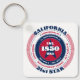 The California State Keychain has a circular typography design with red, white, and blue colours on a white background. The text includes the state's name, capital, state abbreviation, resident's name, region, time zone, geographic coordinates, the year of its statehood, and the country - The United States of America. Unique patriotic gift idea.