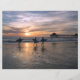 Iconic Huntington Beach "Surf City" photography features trio of surfers silhouetted against ocean, pier and sunset. Perfect backdrop for vacation photos and mementos