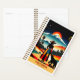 Celebrate the warmth and vibrancy of "California: Where Sunshine Lives" with this eye-catching travel planner! This captivating travel planner features a woman in a multicolored dress and hat standing beside a bear, both gazing at a stunning landscape that blends palm trees and a snow-capped mountain, all bathed in the warm glow of a dramatic sunset. With its retro, surreal style, the artwork beautifully encapsulates California’s diverse scenery and vibrant spirit, making it a perfect tribute to the Golden State’s enchanting allure.