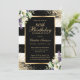 Elegant black and white striped floral 80th birthday invitation featuring a gold frame decorated by gold confetti, calla lilies and greenery.