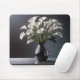 A bouquet of elegant white calla lilies is arranged in a glossy black vase, set atop a dark surface