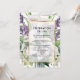 Elegant calla lily celebration of life invitation featuring a gold frame over a floral background of purple flowers, calla lilies, orchids and greenery.