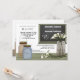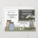 This design features a beige mason jar filled with white calla lilies. A tan and a blue mason jar sit nearby on the oak table along with additional calla lilies that are also resting on the table. A chalkboard hangs on the wall of this rustic but elegant wedding invitation. There is plenty of customisable text for you to personalise this design to suit your event. We also have matching RSVP cards, Thank you cards and postage stamps.