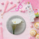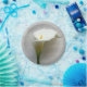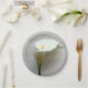 Photo of a lovely white calla lily on an old-fashioned script background, part of a suite of matching wedding items