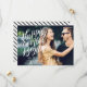 This modern photo wedding save the date card features the brush script phrase, "Happily ever after begins". The couples photo fills the entire card and acts as a background for the script and text. The back of the card features a black diagonals line pattern on a white background. This modern and stylish photo wedding save the date is ready to be personalized and is suitable for someone looking for a modern, trendy save the date card.
