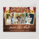 Modern Calligraphy Script, Rustic Wood and String Lights, Watercolor Burgundy Floral Save The Date Engagement Announcement Couple 3 Photo Postcard. Burgundy Roses, Pink Roses, Red Roses, Sunflowers and Botanical Greenery.