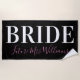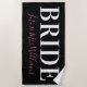 Cute minimalist calligraphy pink, white and black bride beach towel with custom bride future last name to help celebrate the future mrs. during a bachelorette party / bachelorette weekend getaway.