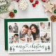 Modern Calligraphy Heart Script Merry Christmas 5 Photo Holiday Card includes Watercolor Green Pine Trees - Green Script
